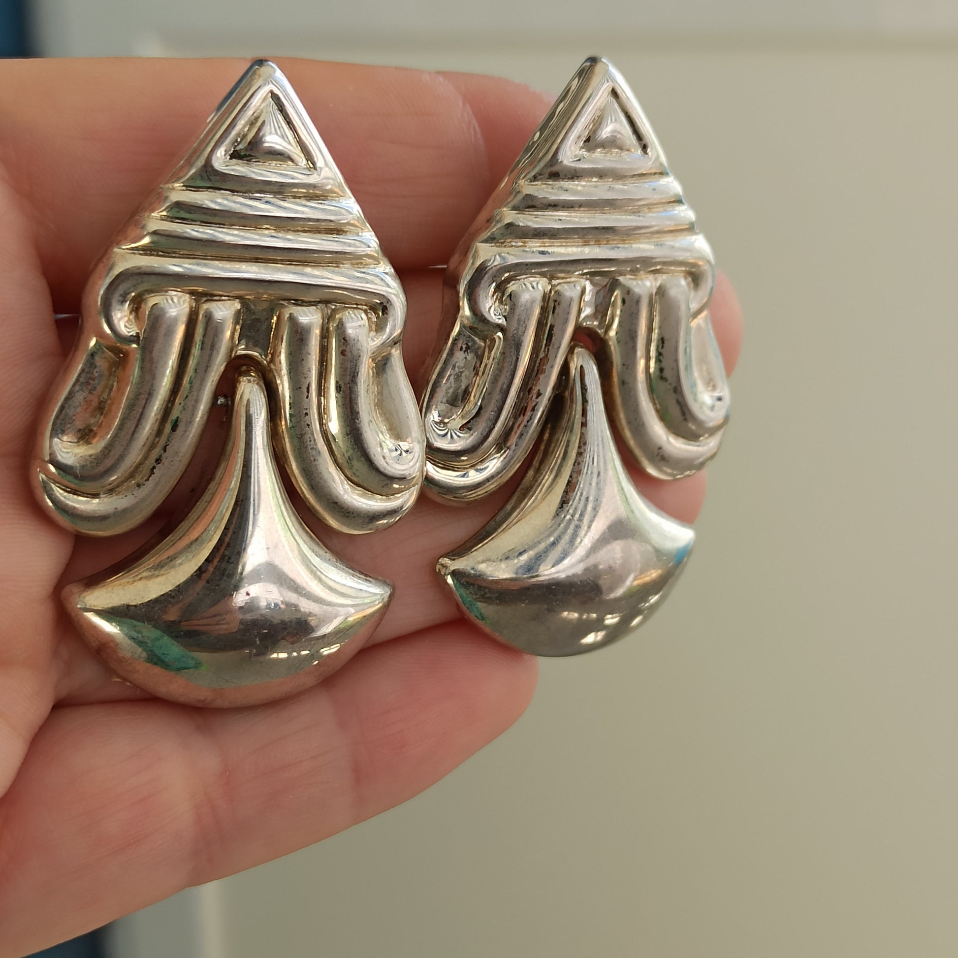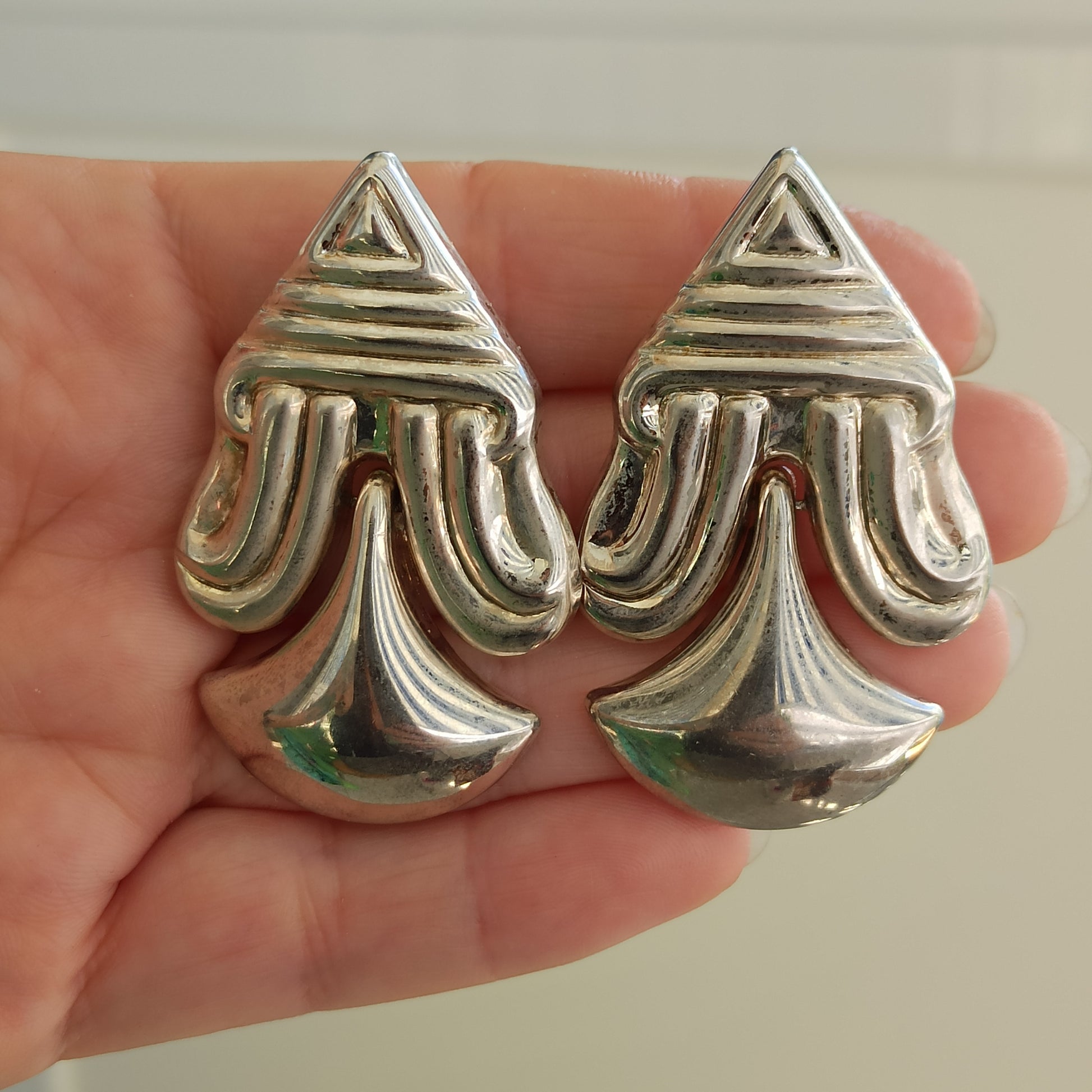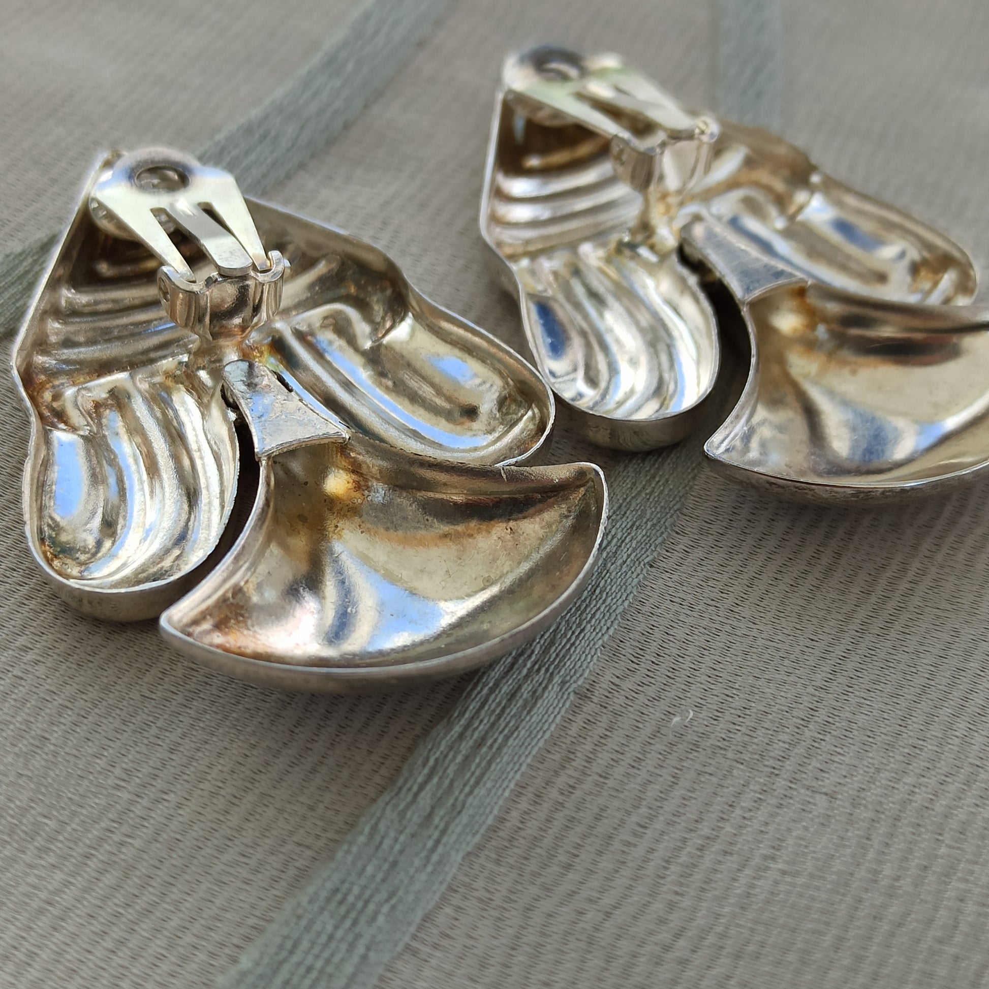 Description: These vintage silver-tone earrings evoke the spirit of ancient desert routes and tribal adornment. Their elongated, oval form and etched surface suggest a dialogue between earth and sky — symbols etched not only in metal, but in memory. Likely dating to the late 20th century, they carry the presence of a distant ritual, reinterpreted through timeless elegance.