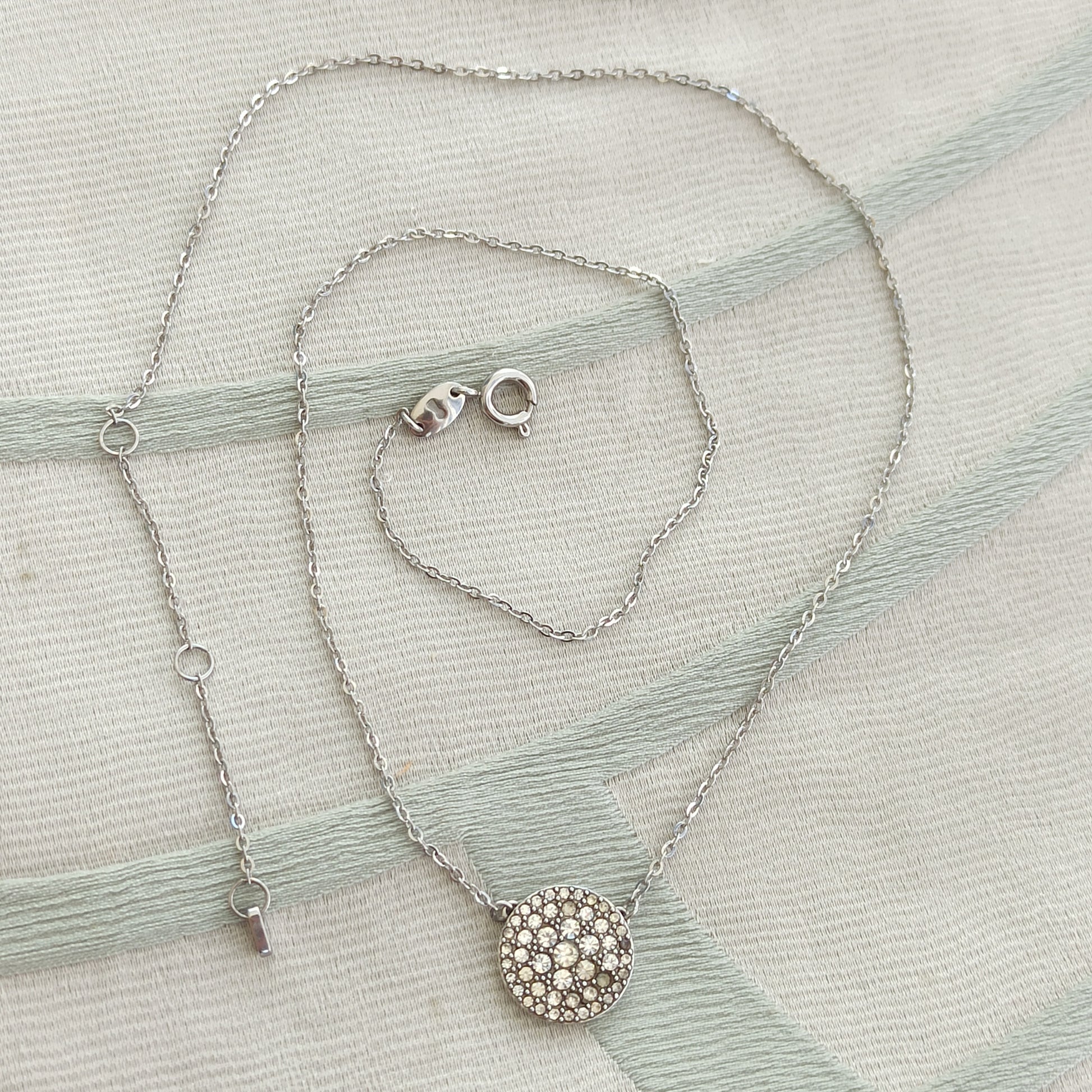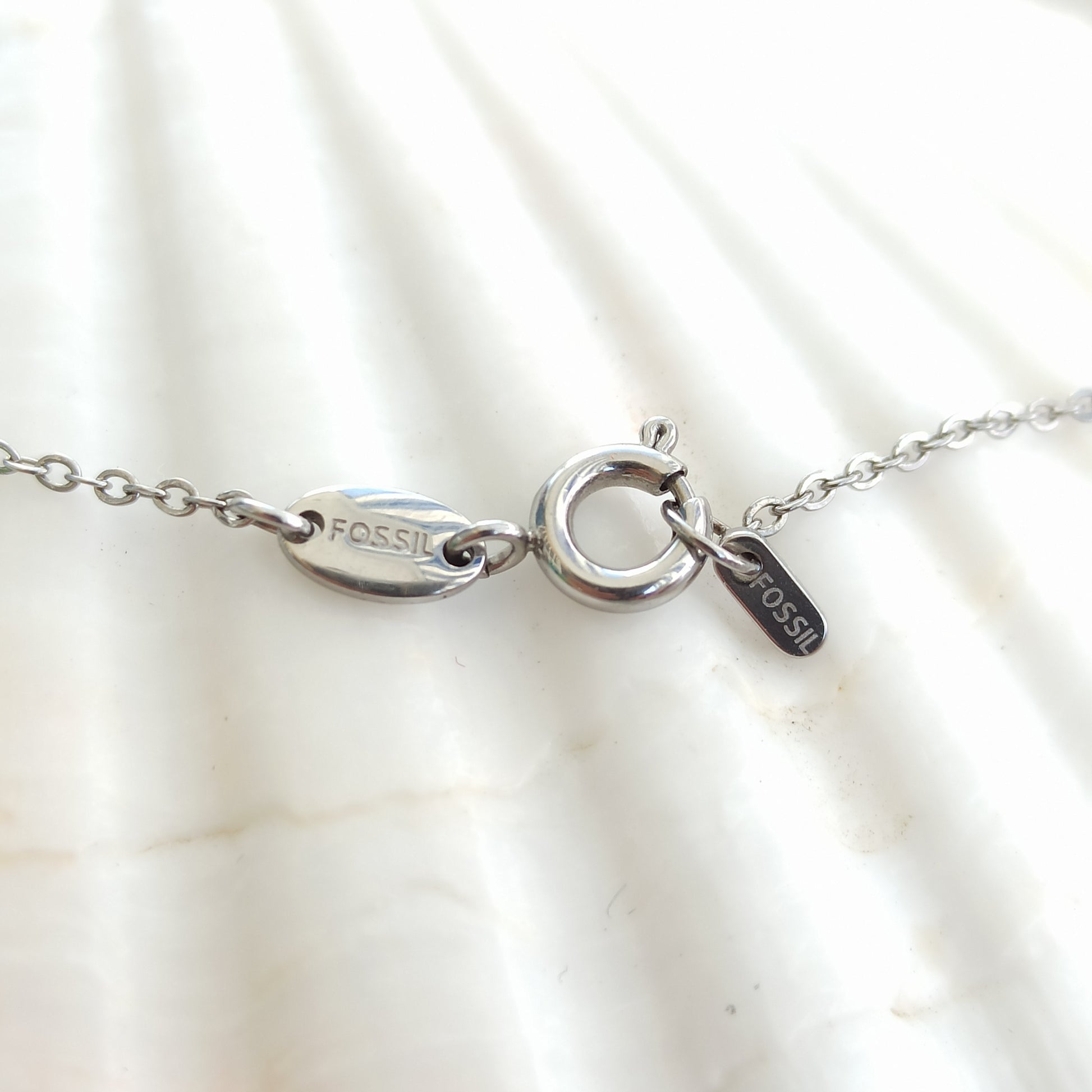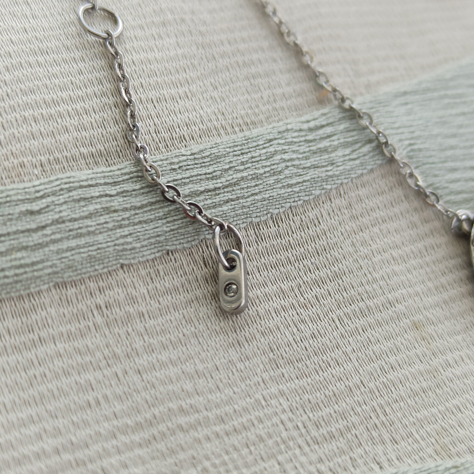 Description: This vintage necklace evokes the quiet elegance of a forgotten rite. A fine stainless steel chain holds delicate faceted crystals that catch and reflect light with subtle reverence. Likely dating from the late 20th century, its minimalist construction suggests both restraint and radiance — a sigillo of understated presence.